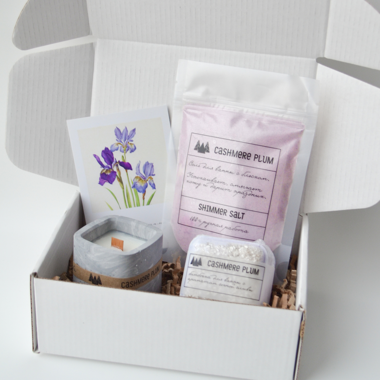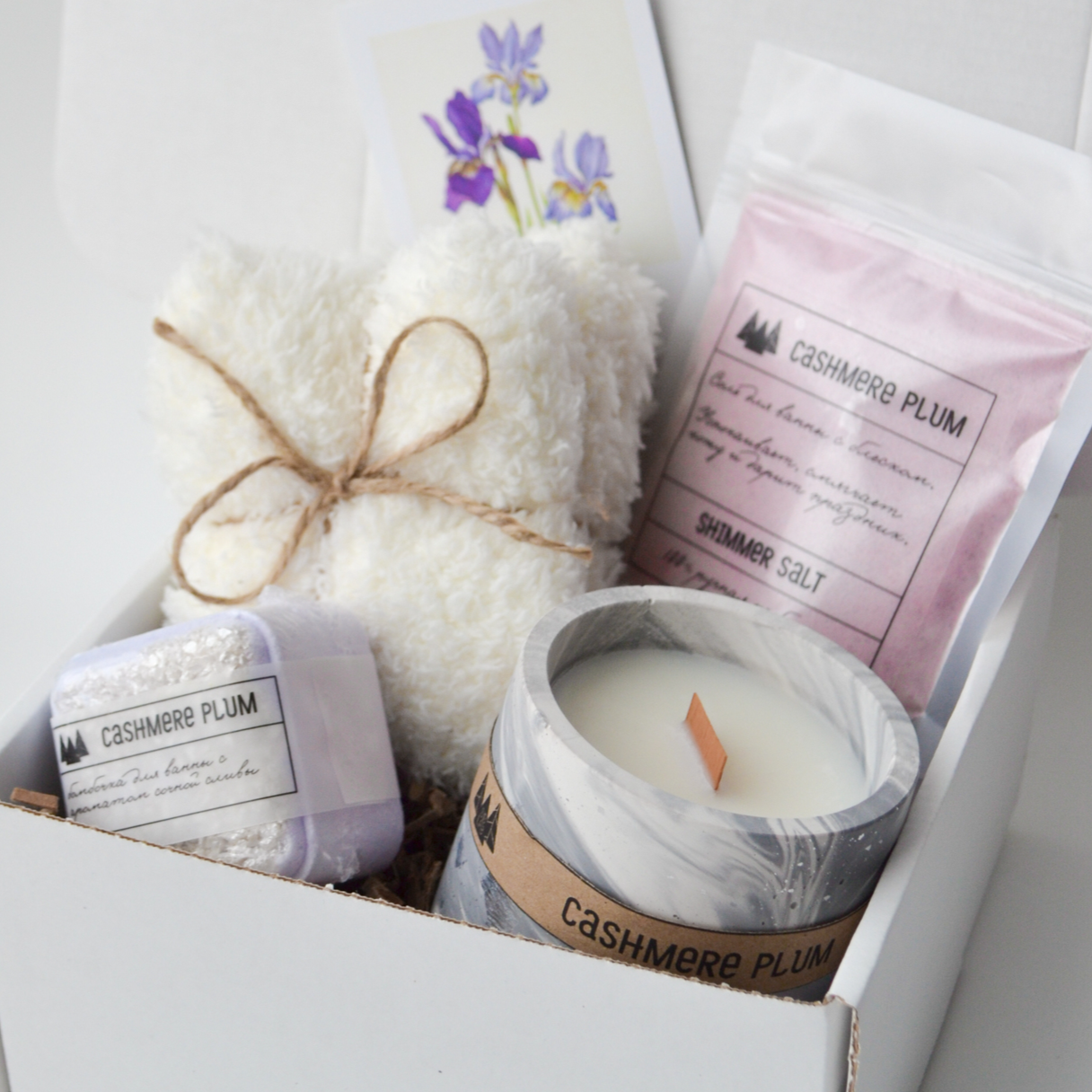 Состав: бомбочка для ванны куб, мерцающая соль для ванны, свеча ароматическая. Все продукты с ароматом "Кашемировая слива".