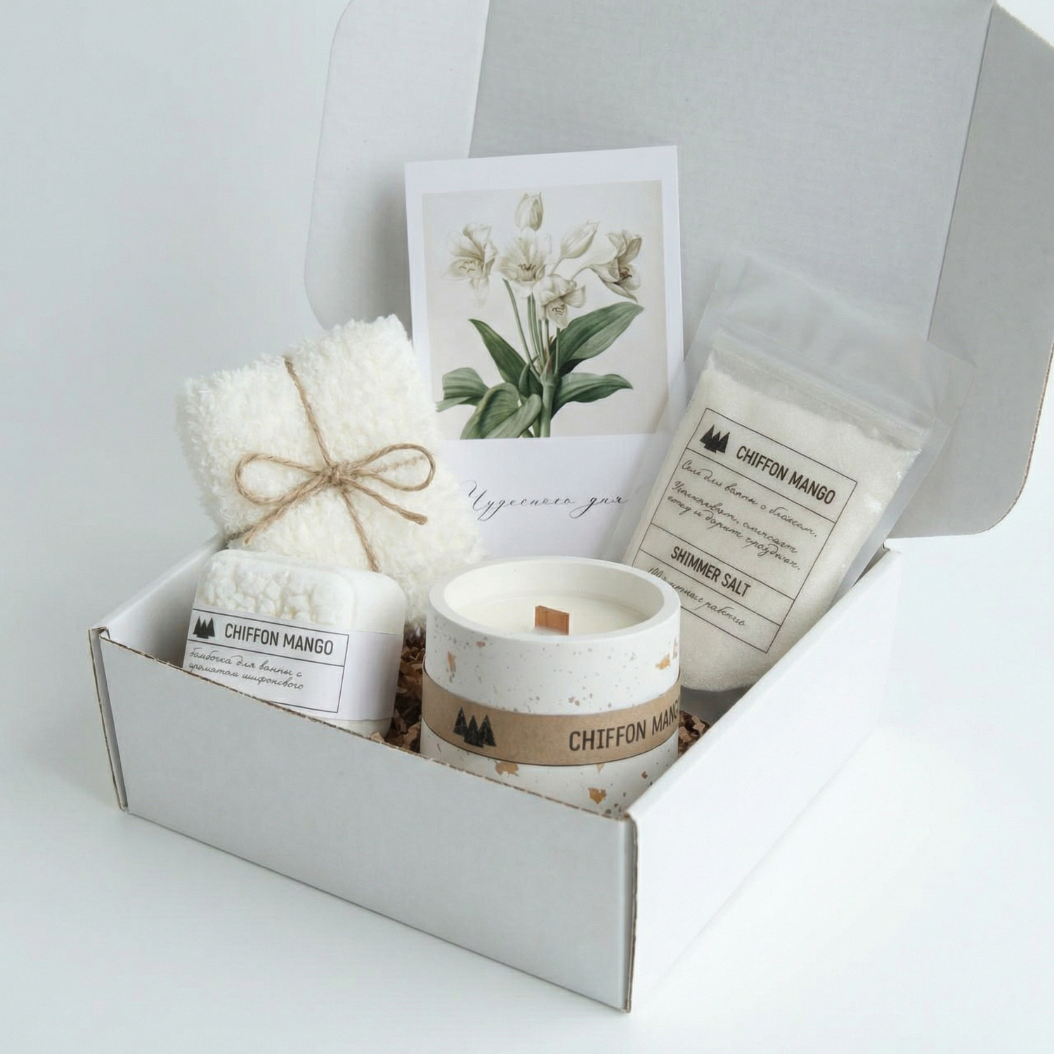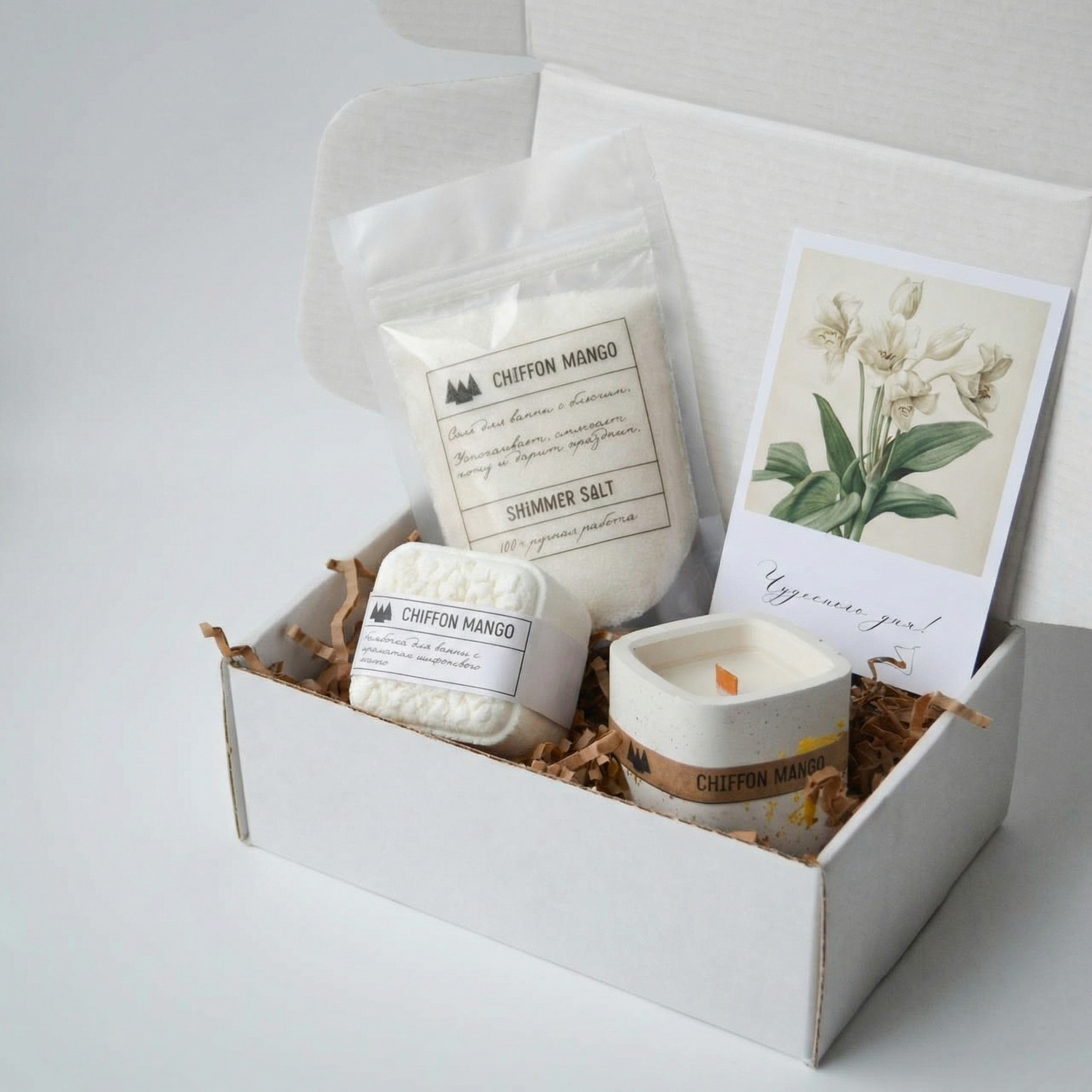 Состав: бомбочка для ванны куб, мерцающая соль для ванны, свеча ароматическая. Все продукты с ароматом "Шифоновое манго".