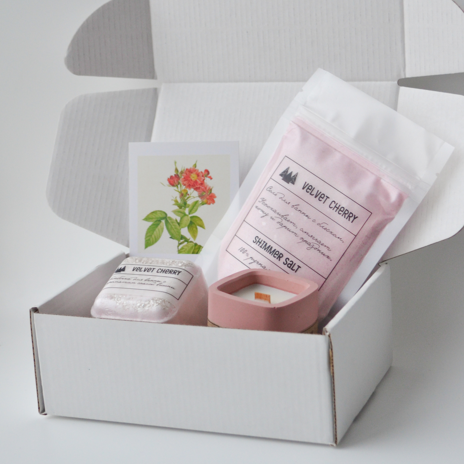Состав: бомбочка для ванны куб, мерцающая соль для ванны, свеча ароматическая. Все продукты с ароматом "Бархатная вишня".