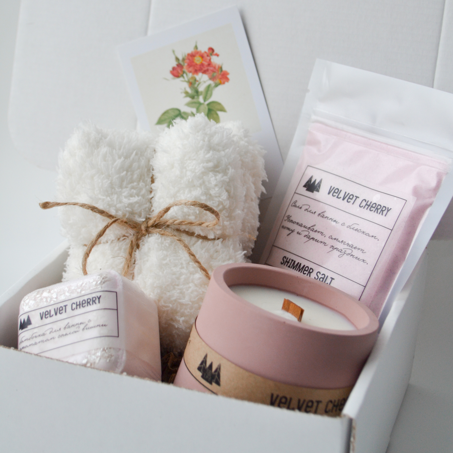 Состав: мягкие носки, бомбочка для ванны куб, мерцающая соль для ванны, свеча ароматическая. Все продукты с ароматом "Бархатная вишня".